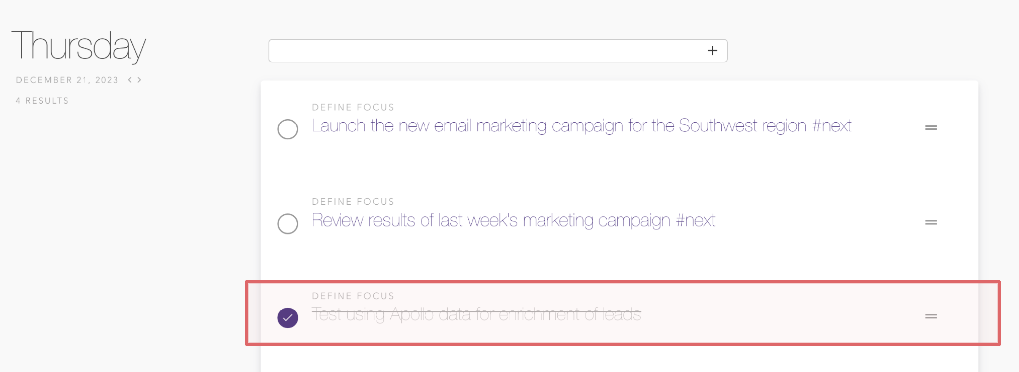 You can set your Prioritizer to show outstanding action items and completed ones, to show only the items you've tagged as "Musts," or to hide anything you've marked done or snoozed.