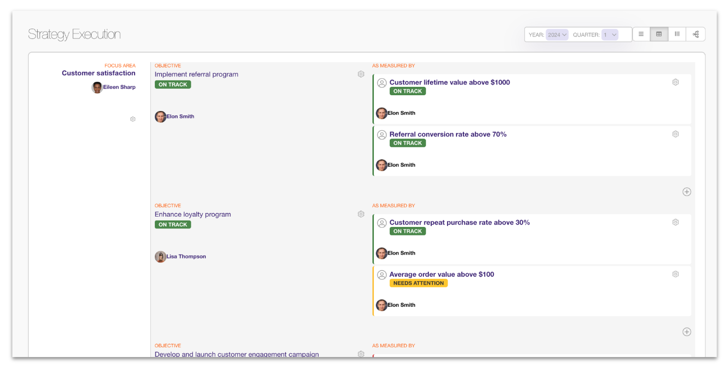 Enter your focus areas, objectives, and key results, and visualize them on this one page. Then, align priorities to the big picture you've set up, so you can speed up daily strategy execution and track progress towards fulfilling your vision.