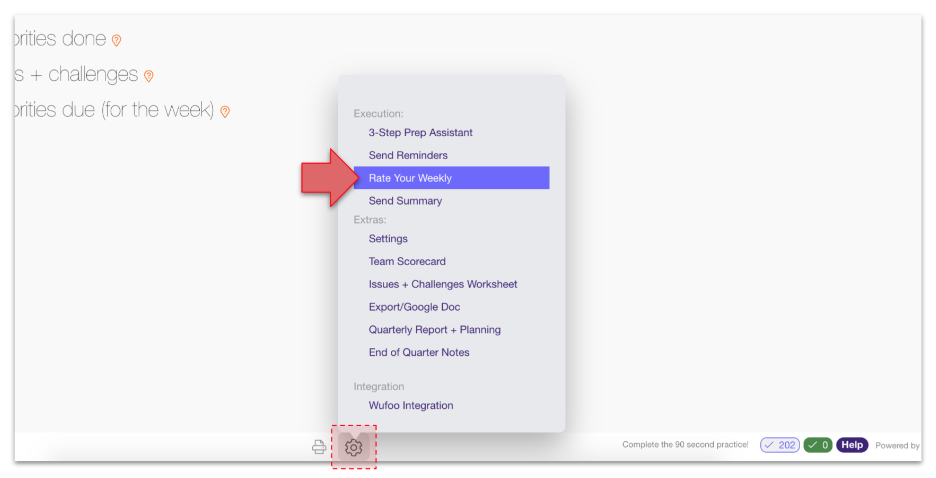 As the final step, everyone rates the meeting. Click the gear icon in the advanced options at the bottom of your screen, then click rate your weekly: