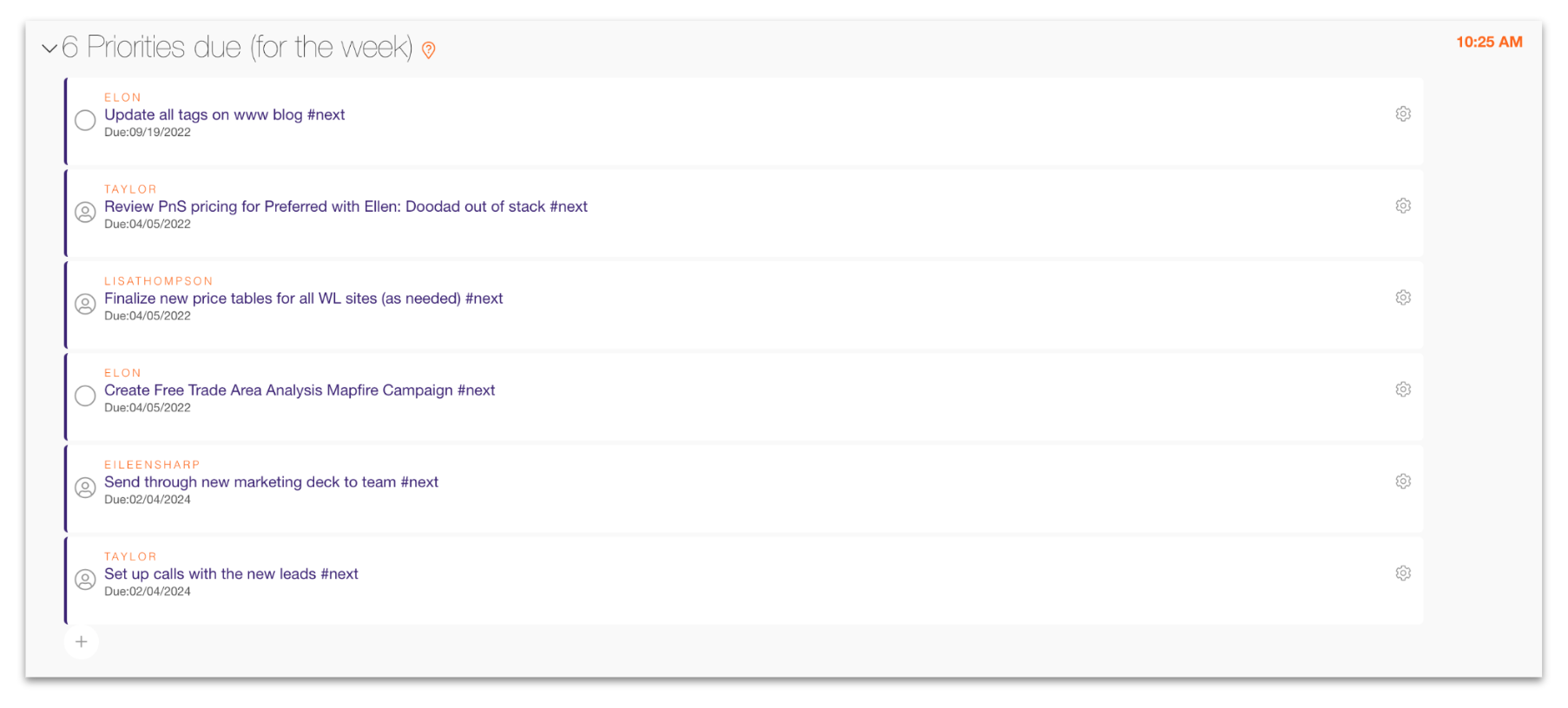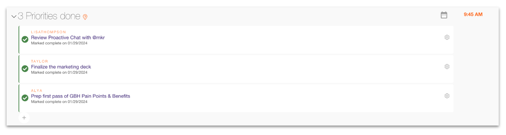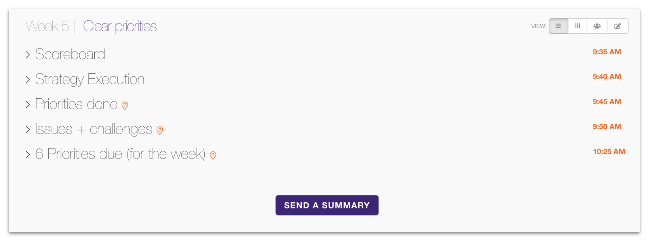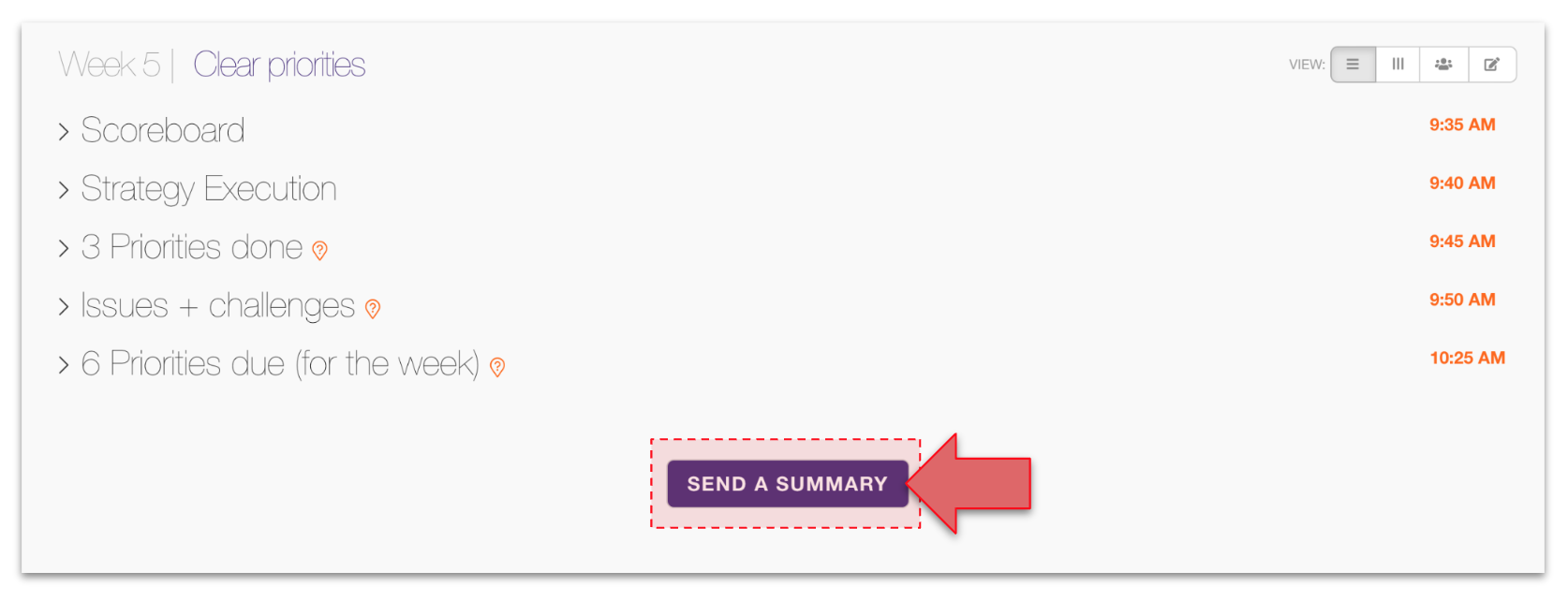 The Priorities done section shows you which priorities were completed over the past week. This section can be reviewed independently so you don’t take much time in the meeting.