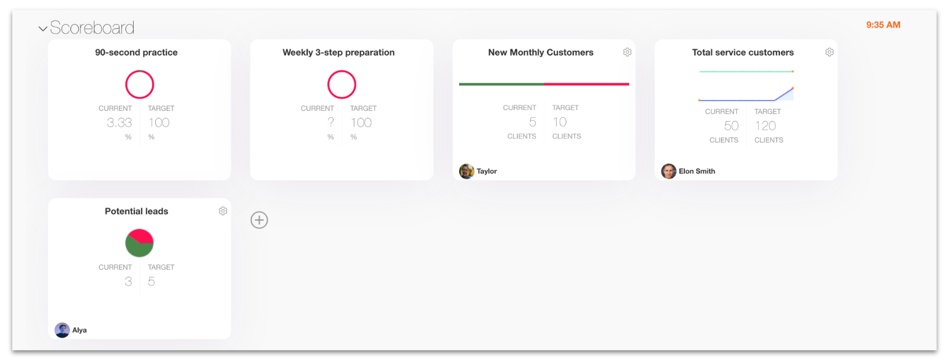 See whether you are making progress toward your OKRs for 10 minutes. As with the scoreboard, flag anything concerning for discussion during the issues section. Use the cog to create a new issue.