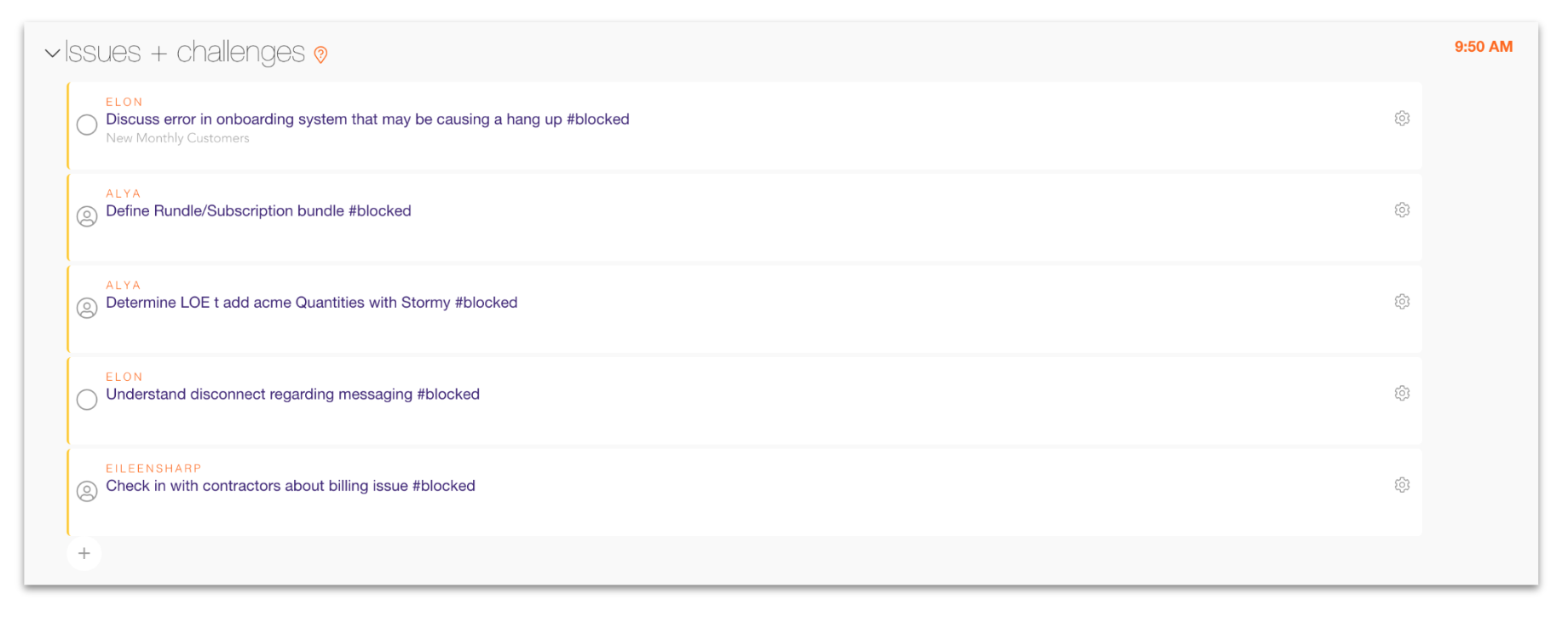 Best practice: if you need more than 10 minutes to work through an issue, you should create an action item to schedule a work-session in the week ahead with the right people. This prevents one or two issues from overshadowing others of similar importance.
