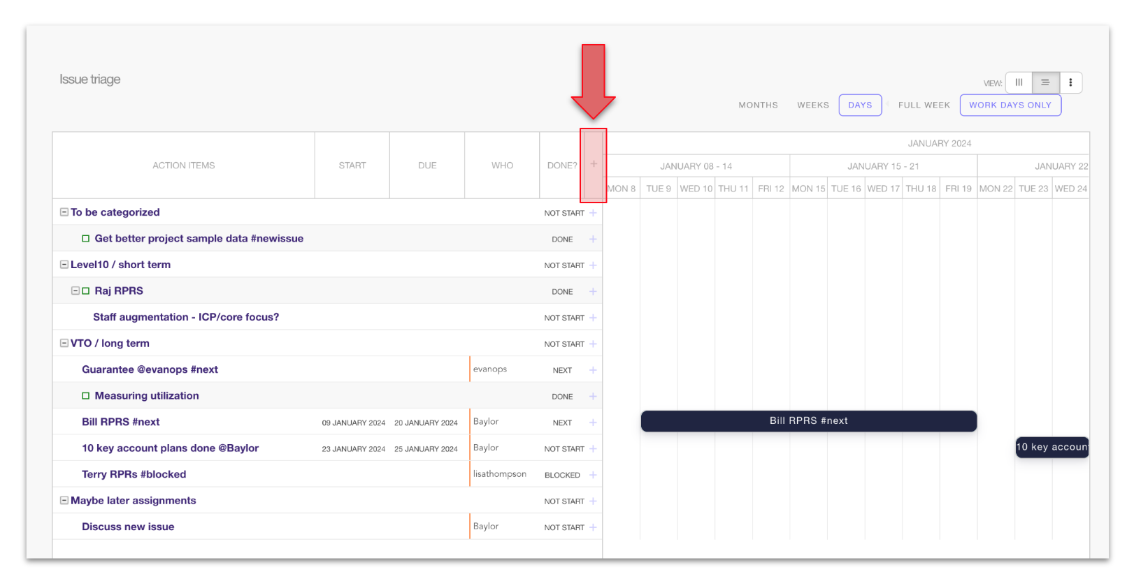 To add a new item while in the roadmap view, click the plus sign at the top of the table, next to DONE.