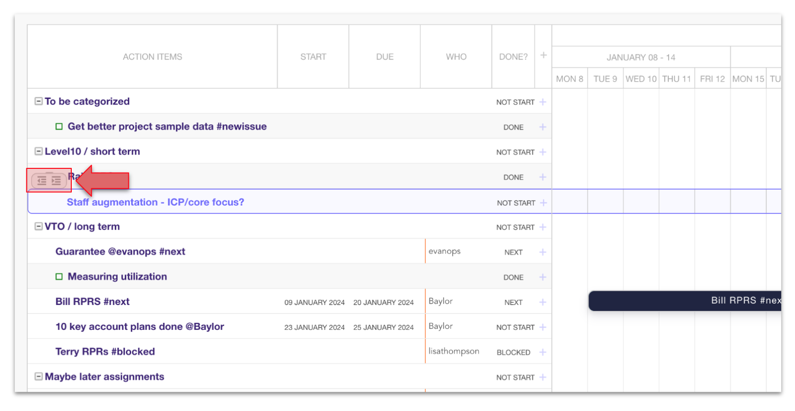 If you're thinking of your project in terms of phases or chunks, this view makes it easy to outline those chunks and get items into them quickly.
