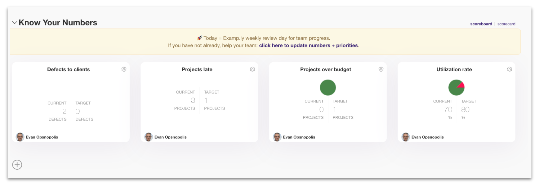 "Know Your Numbers" is there to make sure the numbers that measure success are visible. Quickly see the KPIs you own. You can modify settings or update the values by clicking the gear icon at the top right.