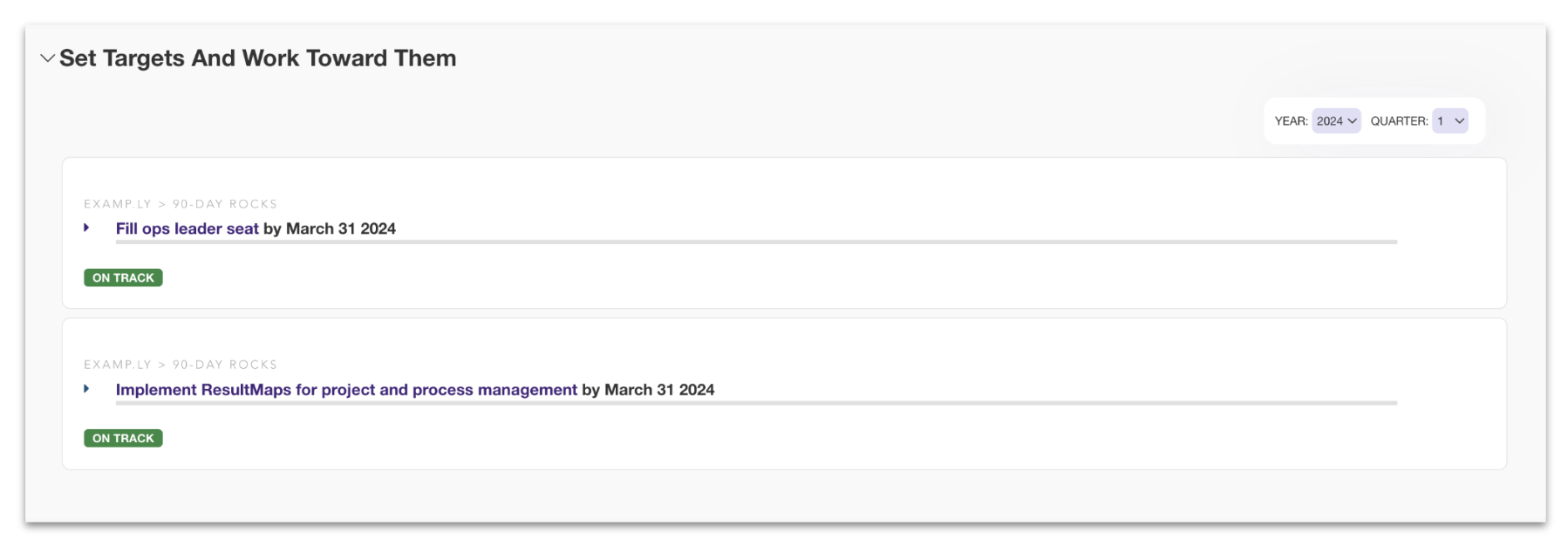 Whether you track goals and align your team using OKRs, “Rocks," or another goal-setting system, the personal dashboard keeps your targets front and center. This section shows you the targets you own, and current progress. Use it to inform prioritization and choose when and how to act.