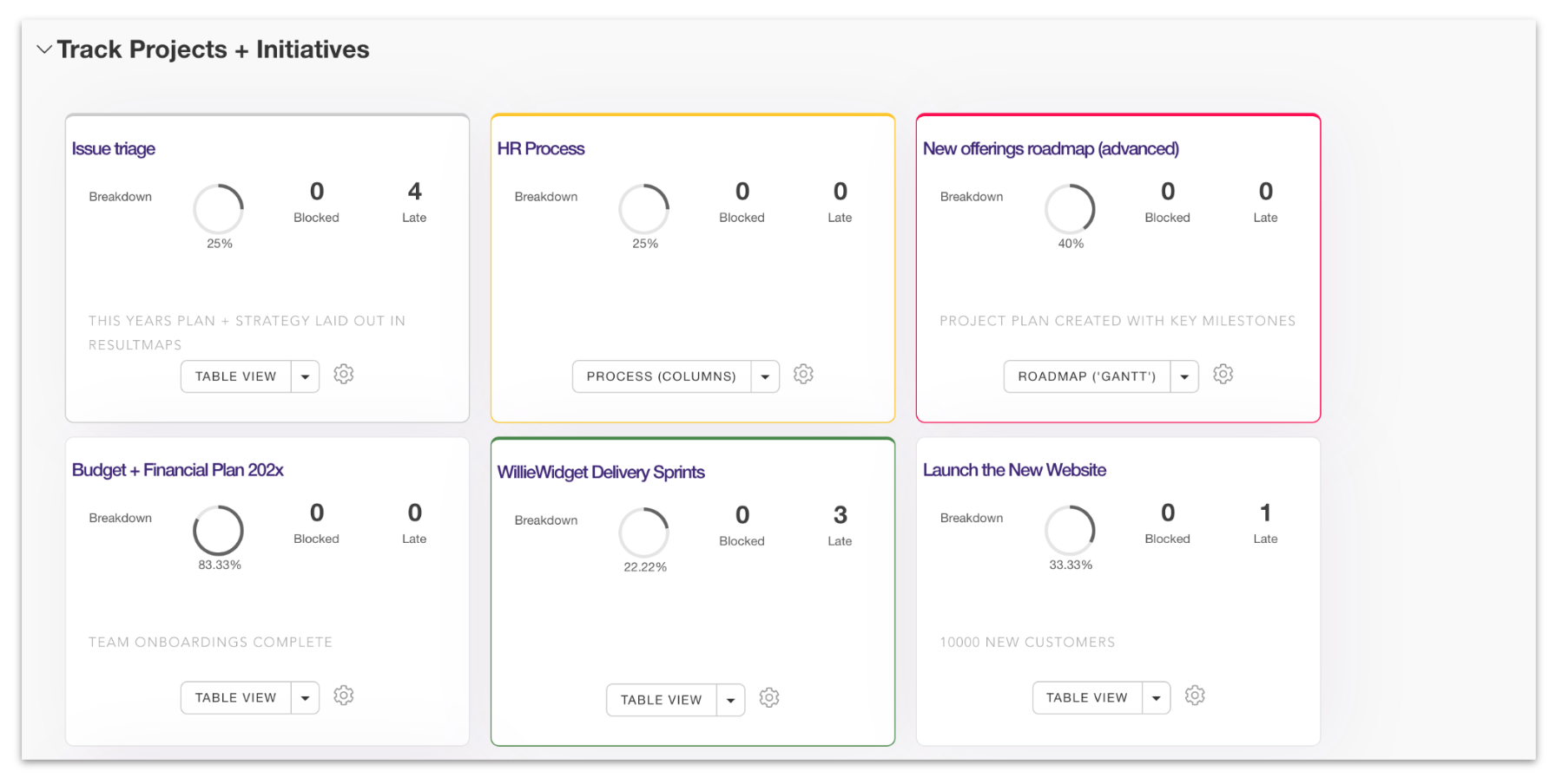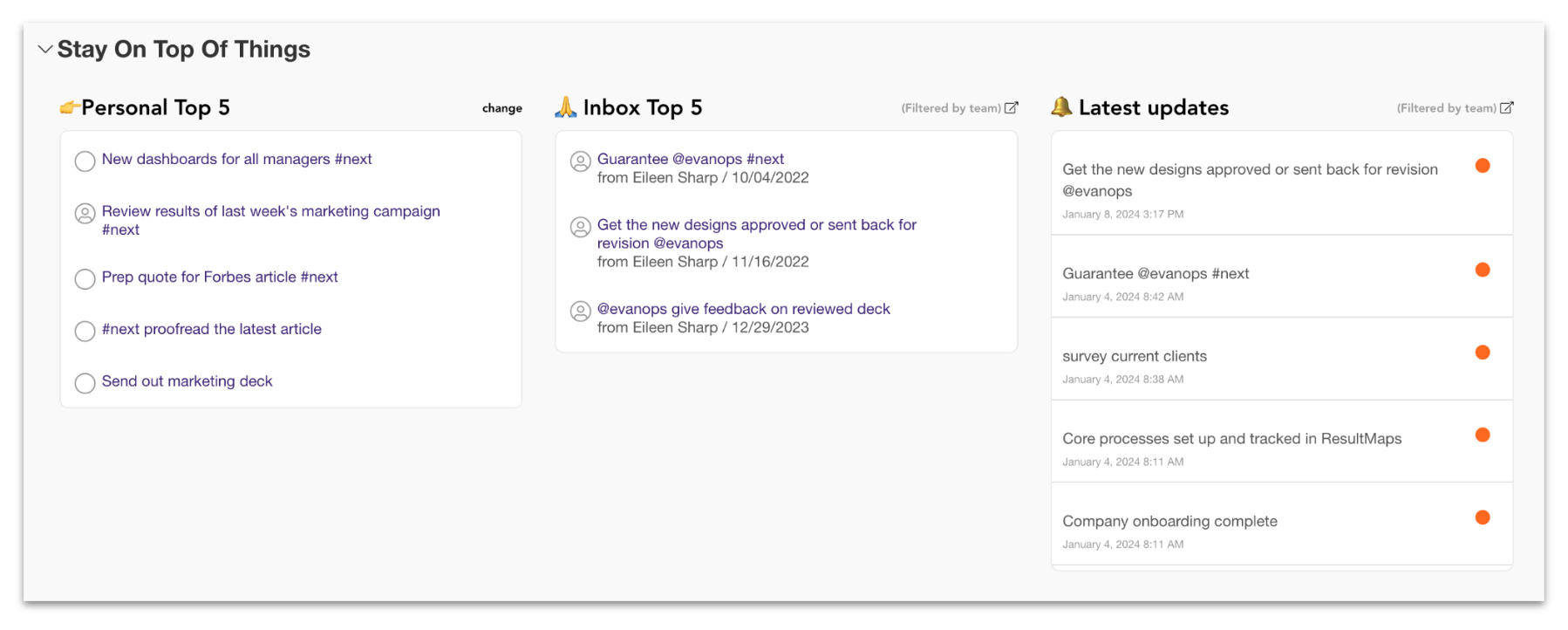 The personal dashboard gives you easy access to things in ResultMaps that are assigned to you. It shows where to focus based on your role, responsibilities, and all the requests and updates that are happening across your teams.
