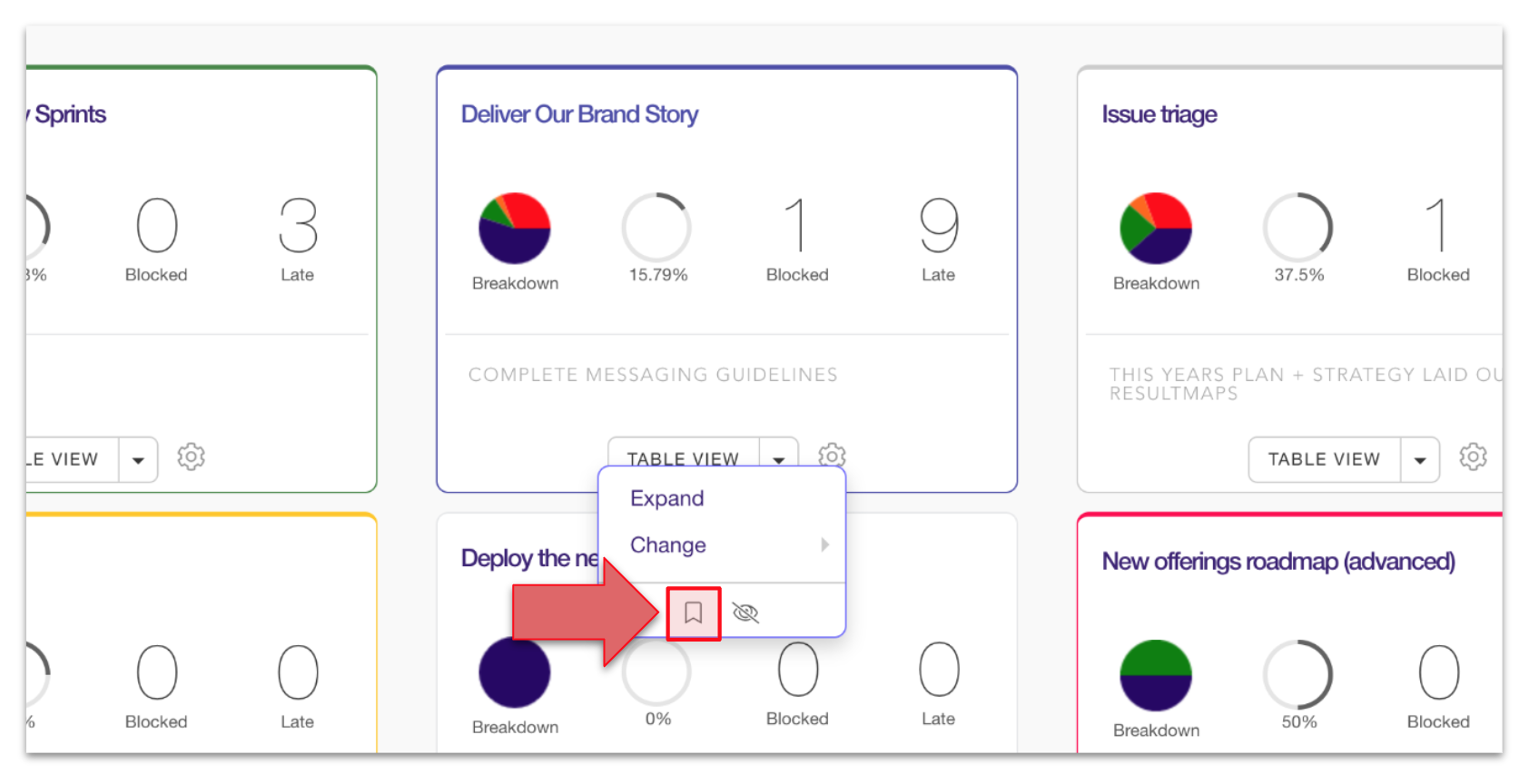 From the personal dashboard under Track Projects + Initiatives, you can get a quick look at the progress being made on specific projects relevant to your day-to-day.